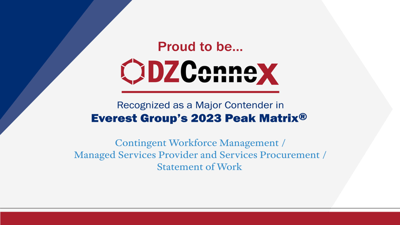PHILADELPHIA, PA – August 30, 2023 – DZConneX, a Day & Zimmermann company, and a leading international total talent solutions provider, is thrilled to announce the company’s recognition as a Major Contender in Everest Group’s 2023 PEAK Matrix™ assessments for Contingent Workforce Management / Managed Services Provider (MSP) and Services Procurement / Statement of Work (SOW). This recognition is based on DZConneX’s commitment to continually enhancing its offerings as well as the breadth and quality of its contingent workforce management, managed services and services procurement management capabilities.
